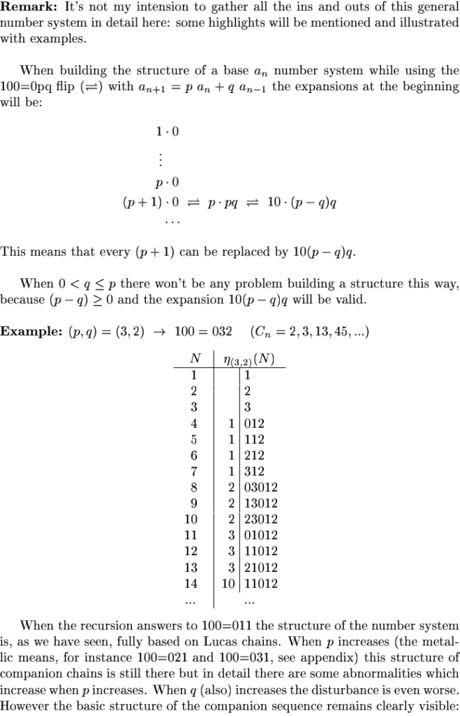 The general definition of the base 100=0pq number systems will lead to the general 100=0pq flip. When 100=011, as we have seen, the structure of the number system is fully based on Lucas chains. When p increases the structure of companion chains can still be recognized. When q also increases the stucture of companion chains will become less visible, although the companion sequence remains the basic structure.